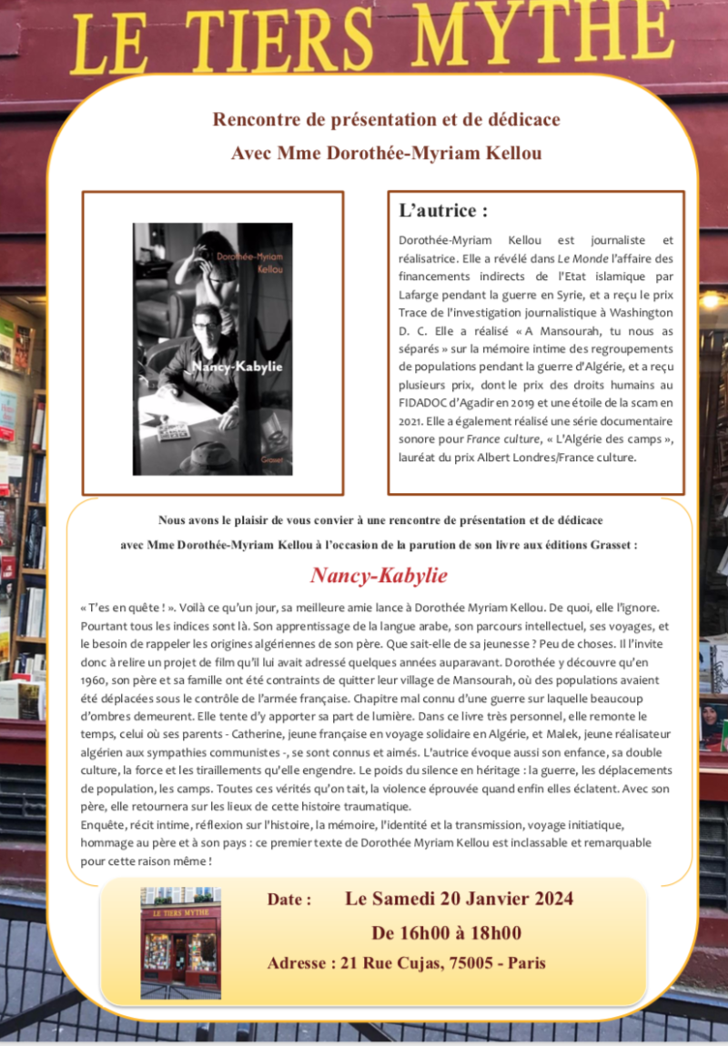 Rdv pour une rencontre littéraire autour de "Nancy-Kabylie" (Grasset) à la Librairie Le Tiers Mythe à Paris le 20 janvier 2024 à 16h. Un évenement co-organisé par le collectif DZ.