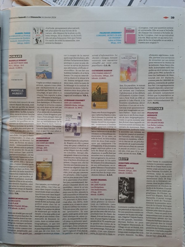 Nancy-Kabylie (Grasset) faisait partie des huit lives recensés dans les pages "livres" du journal Libération le 14 janvier 2023 (édition du week-end)